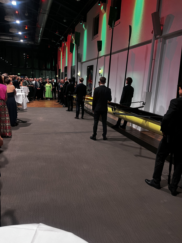 Begonnen hatte der Abend um 19:30 Uhr mit einem Sektempfang in der großzügigen Lobby des Festsaales. Sofort wurde die Gelegenheit zum Foto oder Porträt durch das Fotoatelier Kirsch rege genutzt. Der Keyboarder Aleksandr Kutnevic sorgte durch seine Melodien für eine entspannte Atmosphäre, wobei der Eyecatcher des Saales sicherlich der auf seine Taufe wartende neue Renn-Achter war, der in der Woche zuvor von der Werft Empacher aus Eberbach am Neckar nach Berlin-Neukölln überführt worden war.