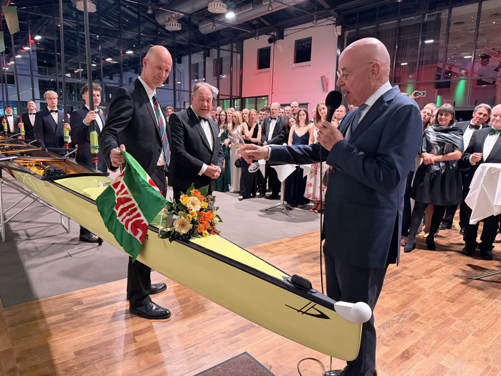 Es folgte dann kurz nach 21:00 Uhr die bereits von vielen erwartete Taufe des neuen Wikinger-Topschiffes, einem gelben Rennachter. Matthias Herrmann übernahm eine kurze Einführung in die Namensfindung. Dabei begrüßte er Herrn Thomas Müller, der als ehemaliger geschäftsführender Gesellschafter der Vereinigten Spezialmöbelfabriken die Taufe vornahm und das Boot unter großem Beifall auf den Namen seines Großvaters und Mitbegründers des WIKING, P. Johannes Müller, taufte. Dabei zerschellte das Sektglas unter dem wuchtigen Schlag auf den Bugnummernhalter in tausende kleine Scherben.